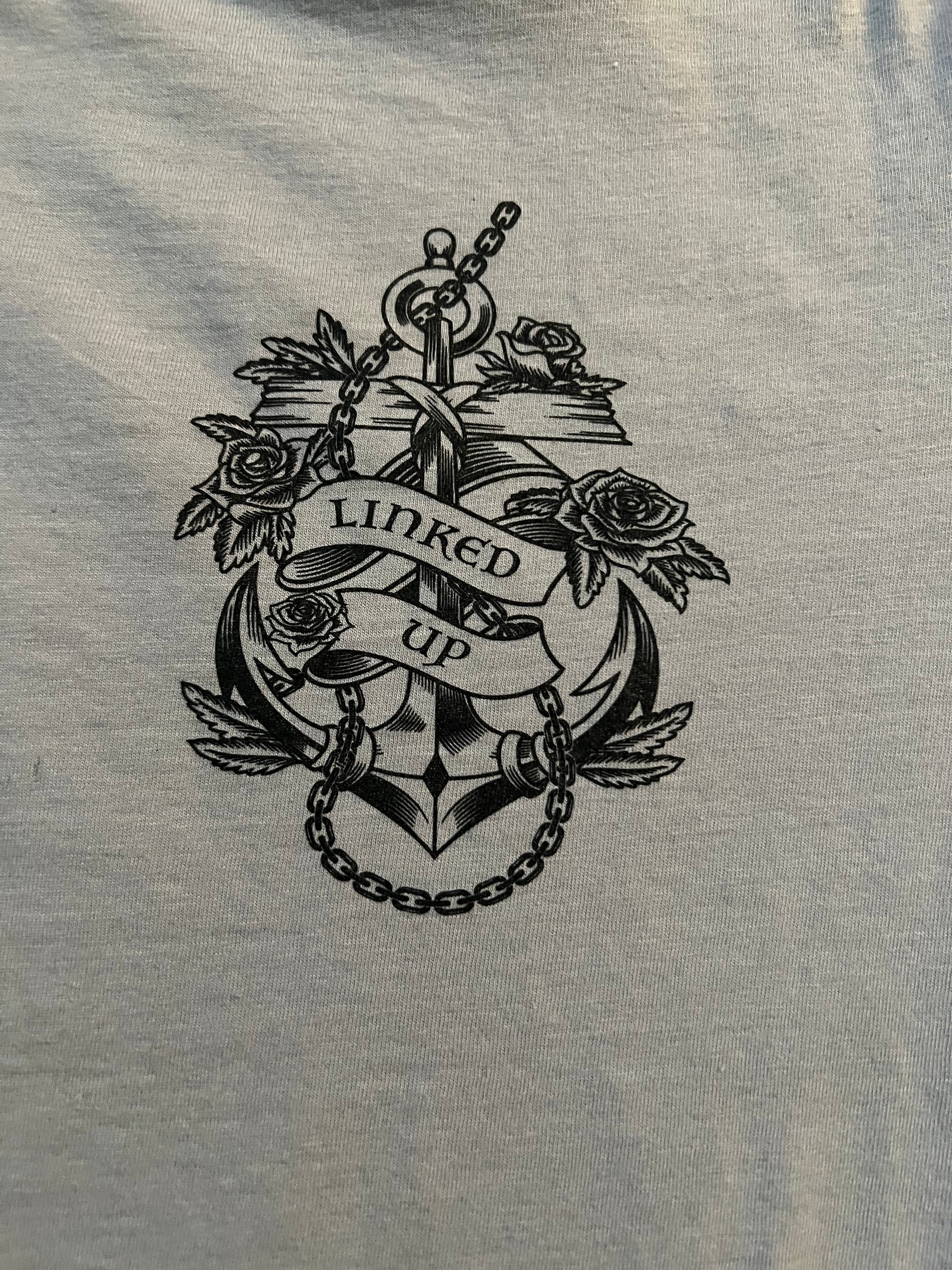 Gildan softsyle black on cement anchor tshirt. Front left chest and back center through the storm anchor logo